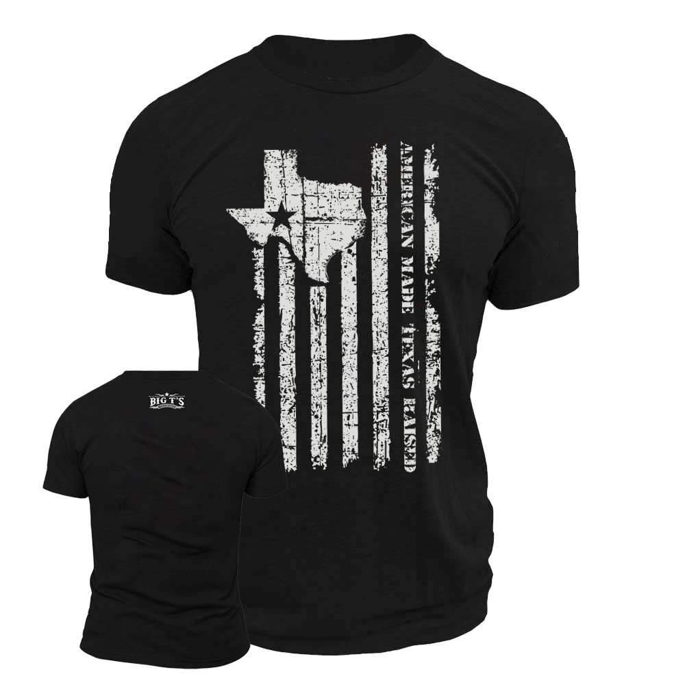 Back: Striking distressed American flag with Texas outline integrated into the stripes, flanked by vertical text reading “AMERICAN MADE, TEXAS RAISED” – a powerful fusion of state and national pride