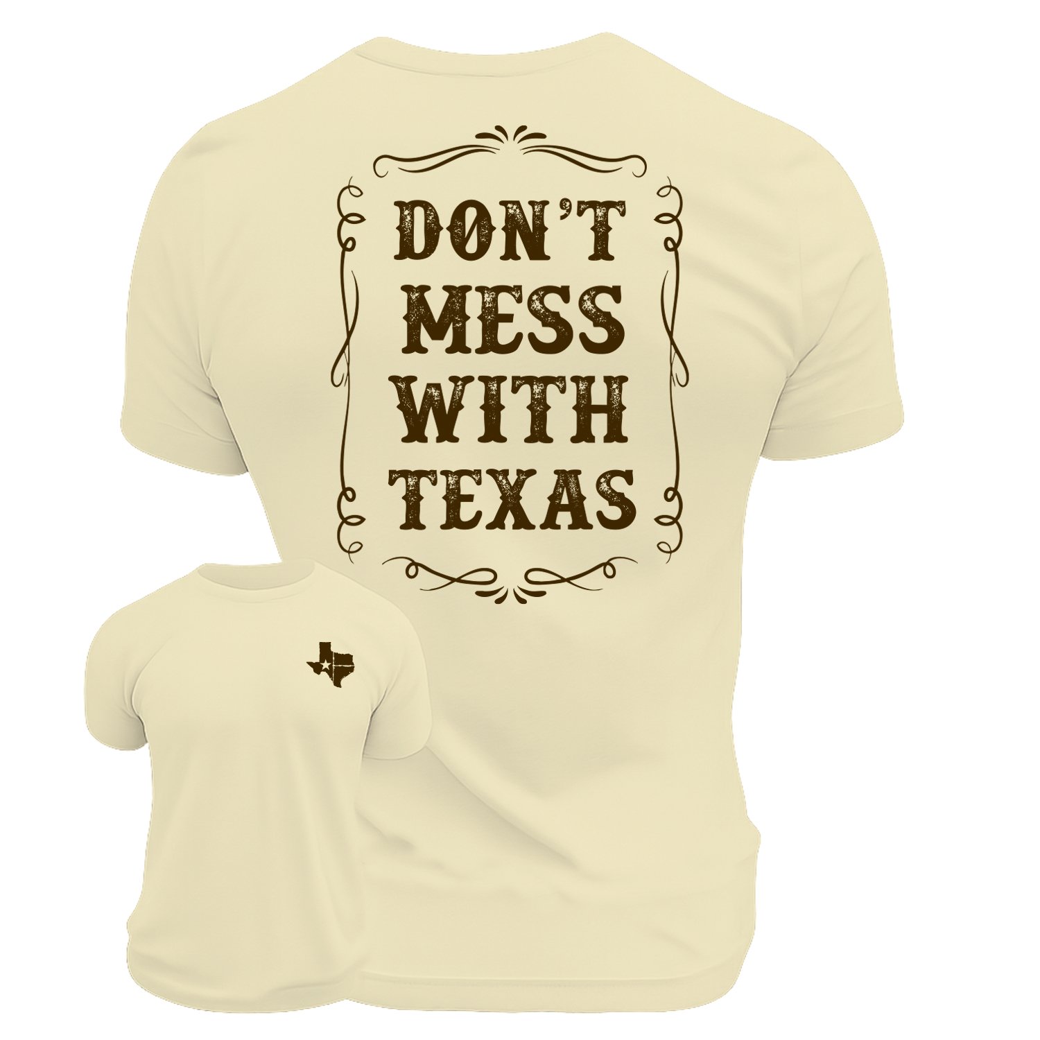 Back: Vintage-style “DON’T MESS WITH TEXAS” print framed like an old saloon sign – a nod to Texas grit and heritage